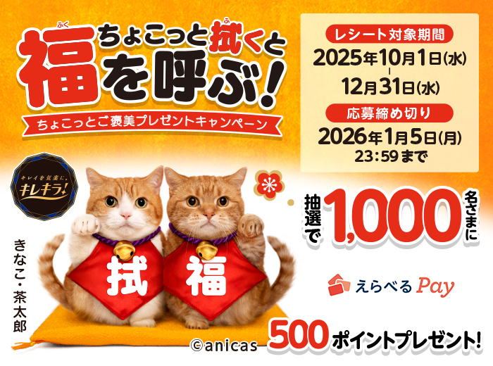 現在お使いの商品のバーコードと、お買い上げ対象商品のレシートで応募すると、先着2万名さまへ、QUOカードでキャッシュバックします。