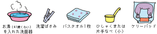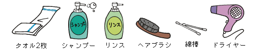 ・水、お茶:入浴後の水分補給として、体調に合わせてコップ1〜2杯程度の水分を準備する。
