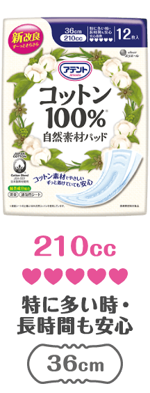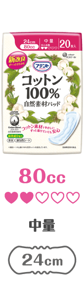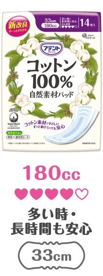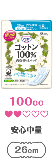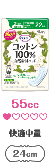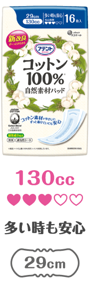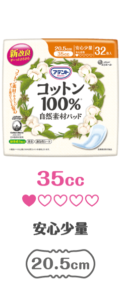 現在各社から発売されている吸水パッドの表面シートは化学繊維製が主流(※2020年 当社調べ)ですが、アテントコットン100%は天然コットン100%の表面シートを採用。