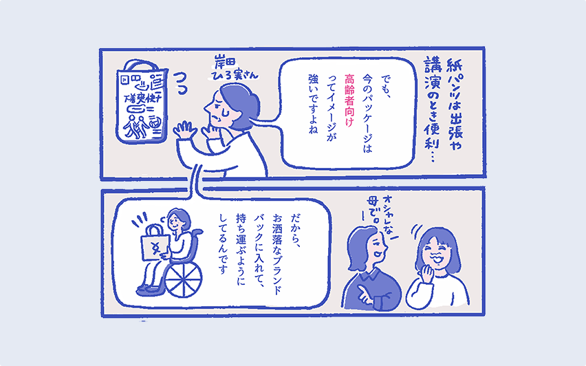 岸⽥ ひろ実さんやっぱり今の紙オムツのパッケージって、高齢者のイメージで。赤ちゃんのオムツって、いずれ成長して使わなくなる前向きな前提ですよね。でもわざわざ高齢者のオムツって限定しちゃうと、できなくなることが増えていく中で使うものって感じで、テンションが下がります。一方で今、生理用のナプキンってすごいオシャレになっていて、買うのも恥ずかしくない。そんな風に、紙パンツもカッコいいパッケージになれば、恥ずかしくなくなるのかなって思います。