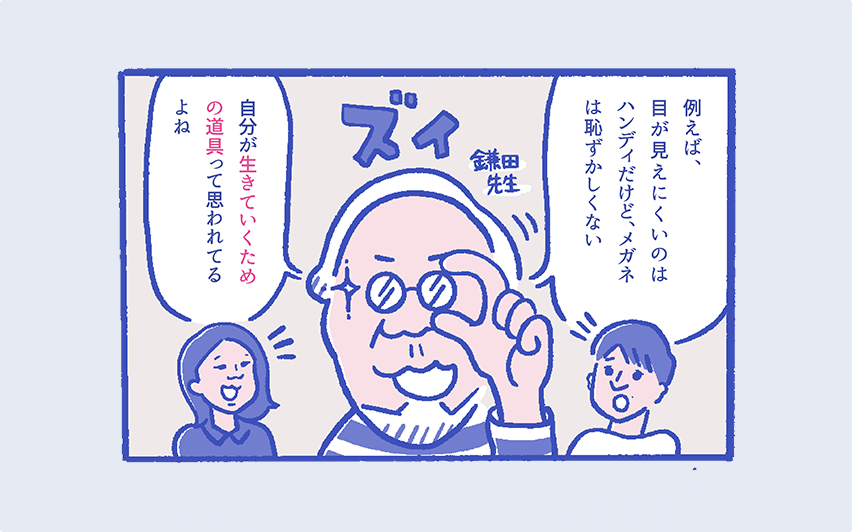 岸⽥ 奈美さん鎌田先生の「道具」っていう捉え方いいですね。年老いたから使うんじゃなくて、必要だから道具として使うっていう認識になればいい。でも、今のこの男女が歩いているイラストからは、「これを使ってハツラツに歩いてください」という圧を感じちゃうんです。