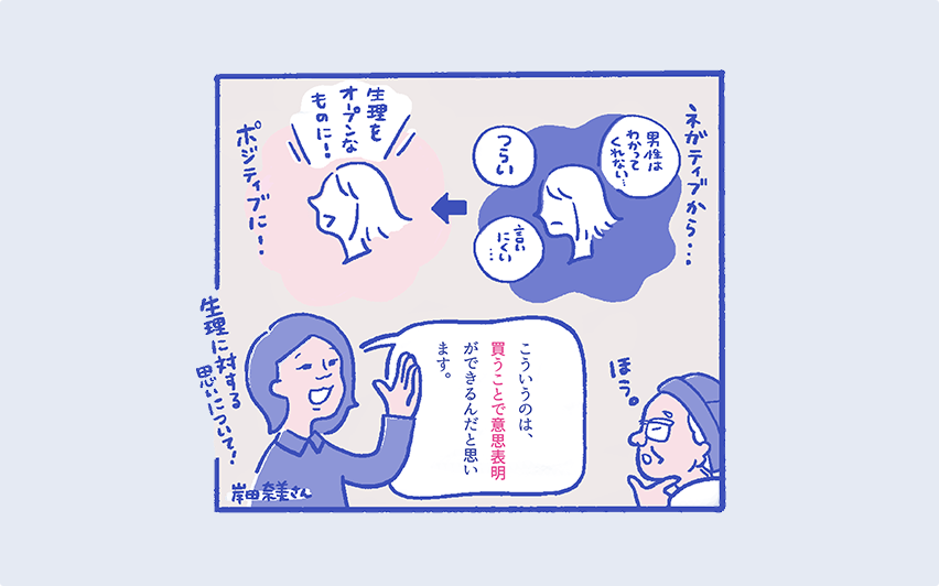 岸⽥ 奈美さんまさに最近フェムテックのかっこいい生理用ショーツを、オシャレで気分が上がるなと思って買いました。生理をかくさないといけないとか、男性に痛みや不調がわかってもらえないとか、鬱屈した思いを多くの女性が抱えている中で、そういう商品を選ぶこと自体が、「わたしは自分らしく生きていく!」っていう表明になる。だからアテントも、抱えているモヤモヤを意志表示できるような、強めのデザインでもいいなと思います。