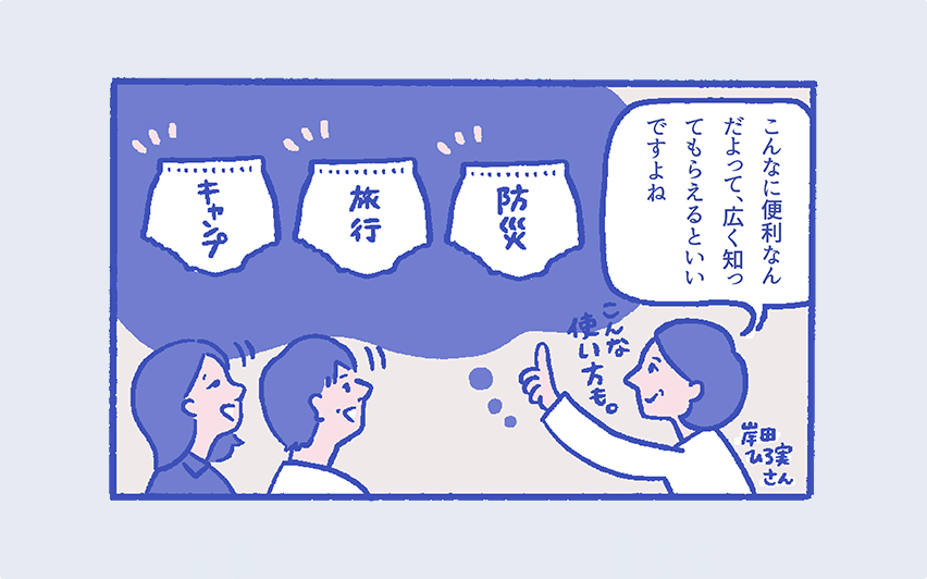 岸⽥ ひろ実さん他にも、すごい高熱が出てトイレに行くのも大変っていう時に、紙パンツはいいんですよね。災害でトイレが使えない時にもいいですし。外科医の先生も手術中にはいていたり、本当は広く使われているものなんですよね。