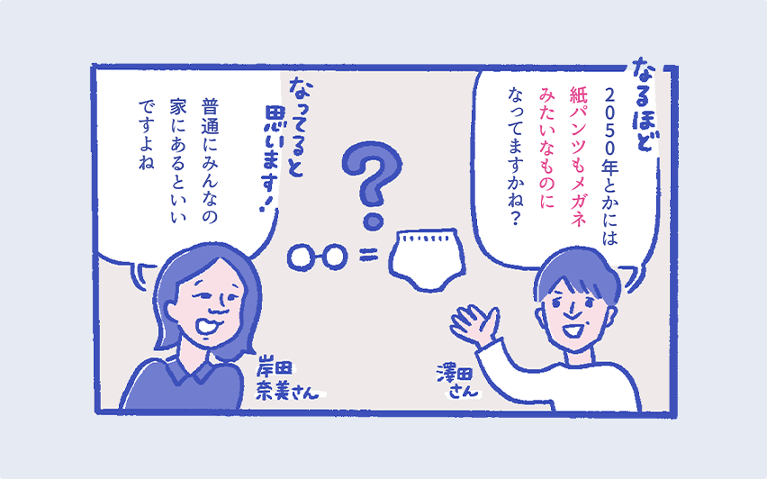 澤田さん(司会)パンツとかオムツの概念を超えて「新しい何かを手に入れているんだ」という気持ちになれるパッケージならすごくいいな。僕は子どもの頃、クラスで最初にメガネになった子だったので、いじめられたりしていたんですけど、今ではファッションとして大事なアイテムですもんね。2050年の日本ではパンツってメガネみたいな存在になっていると思いますか?