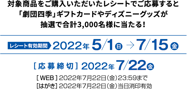 レシート有効期間中、対象商品を、各コースの応募に必要な金額分お買い上げいただいたレシート、または納品書で応募できます。