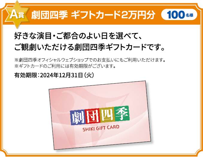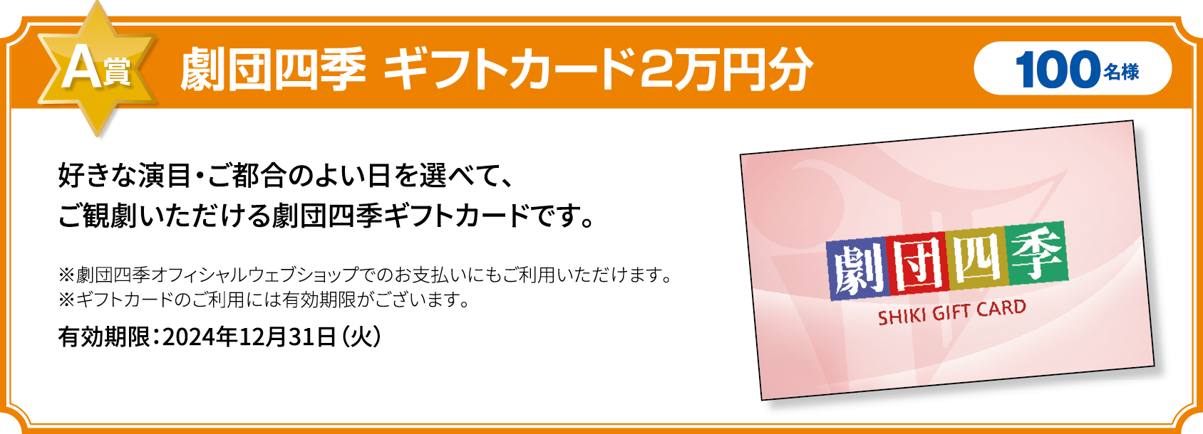 | 【A賞】 | 劇団四季 ギフトカード2万円分 | 100名様 |