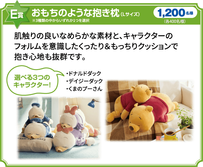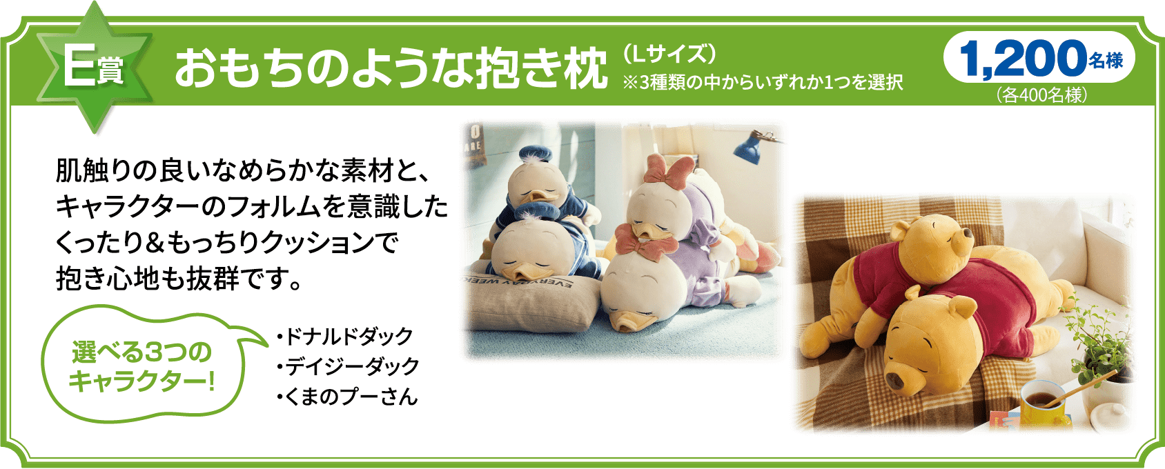 | 【E賞】 | おもちのような抱き枕(Lサイズ) ※3種のうちいずれか一つを選択 | |