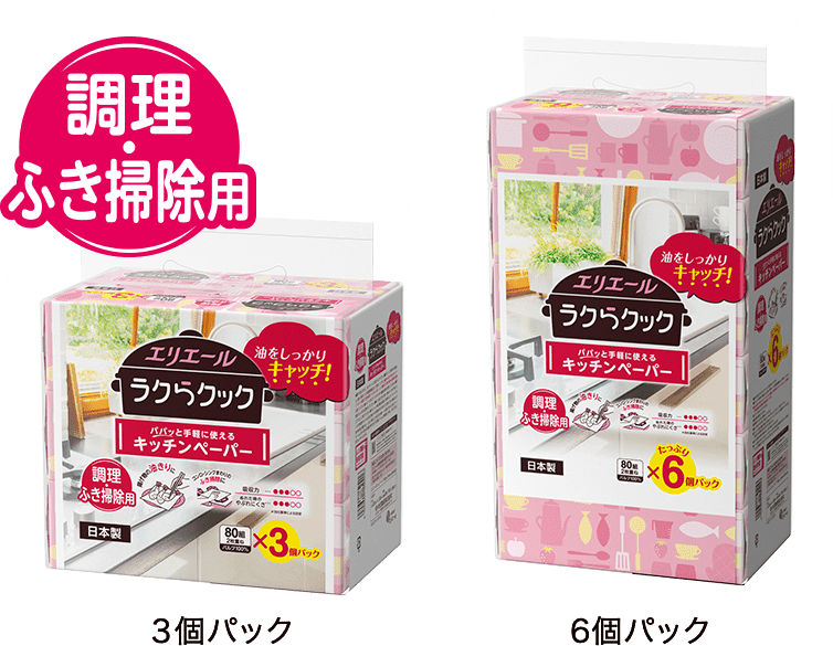 “ラクらクック”!忙しい調理の合間に、片手でサッと!最後まで取り出しやすいキッチンペーパーでお手軽に♪ゴシゴシふいてもやぶれにくいペーパーふきんなら、布ふきんの代わりにお掃除も簡単・衛生的♪