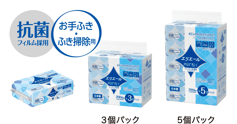 パルプ100%の素肌にやさしいやわらかな肌ざわり。しっかりふき取れる安心の吸水力。抗菌フィルム採用。