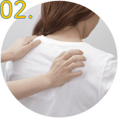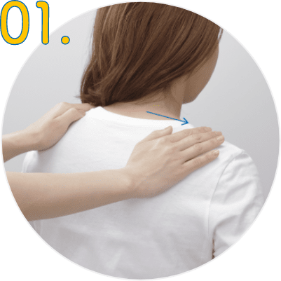 相手を驚かせないよう背部に触れることを告げてから始めます。背中に手を置き、肩の中心部から腕の方向に触れていきます。