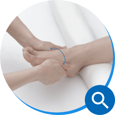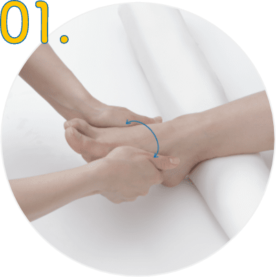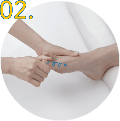 触れる側の足を露出し、他は保温を心がけます。手で足全体を覆い足背を左右に伸ばすようにします。