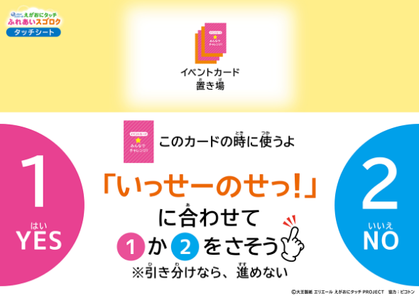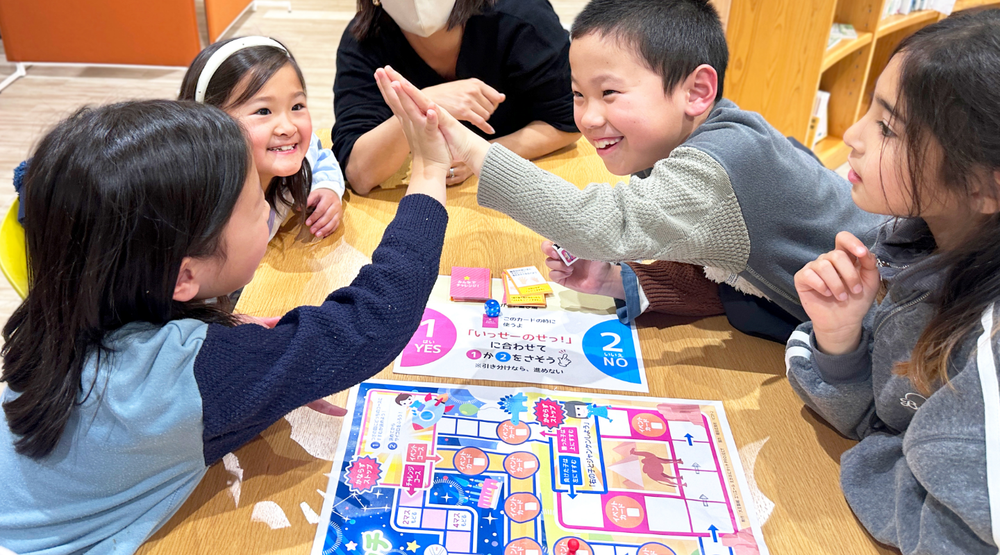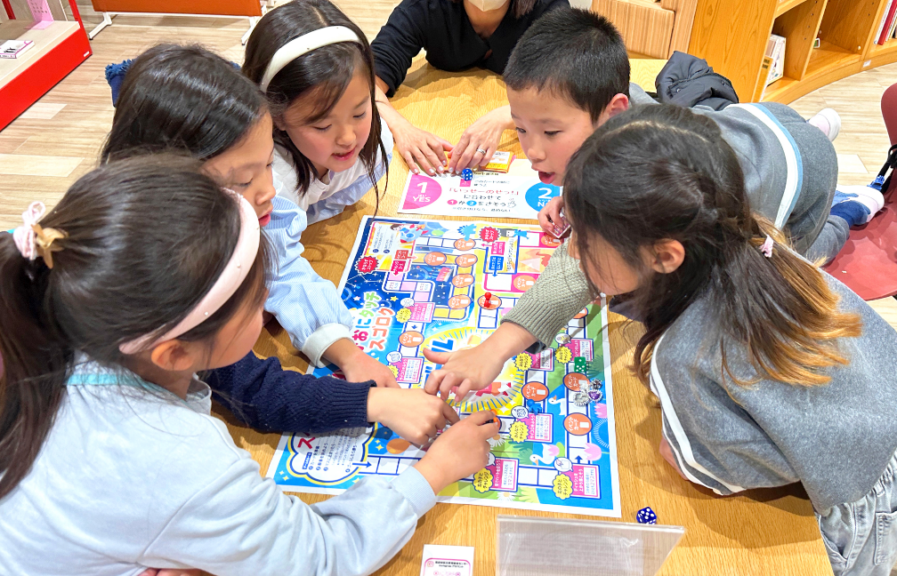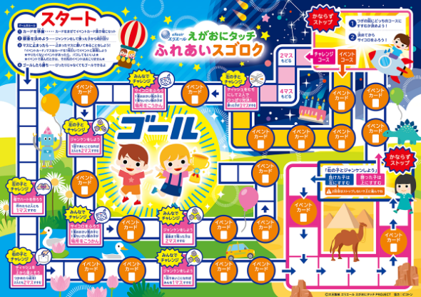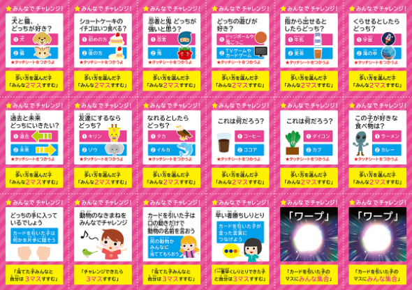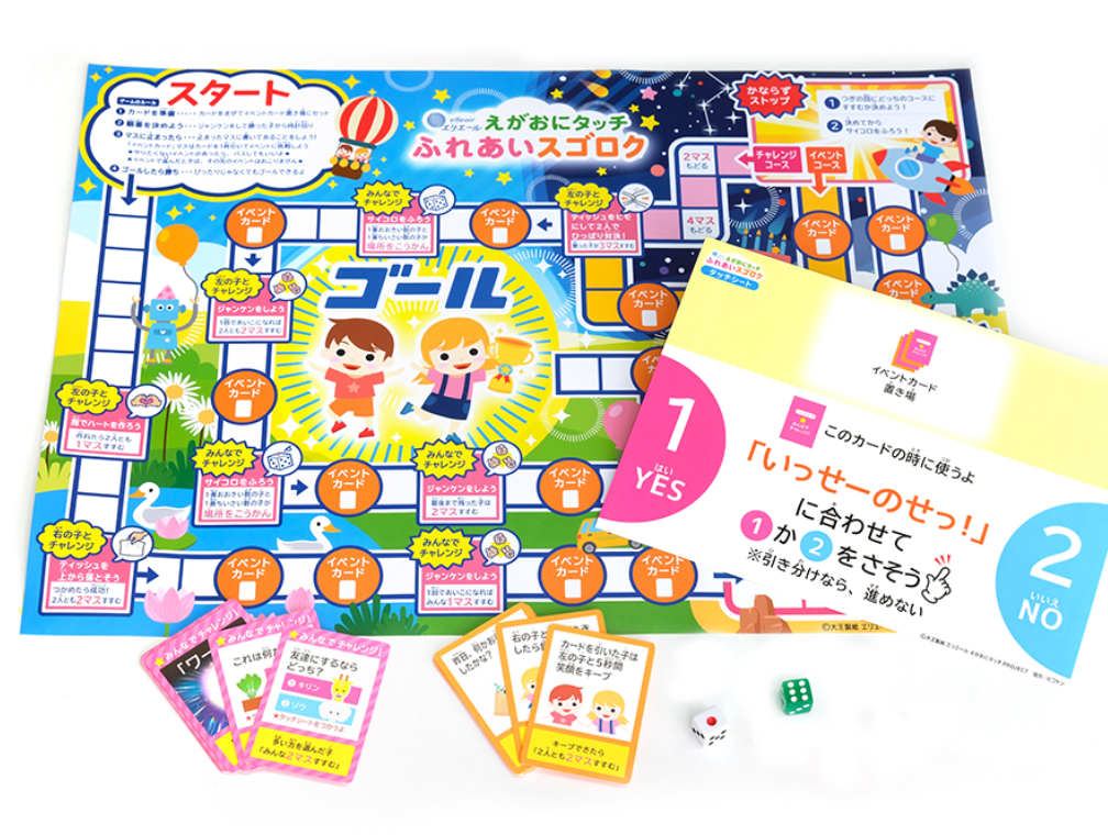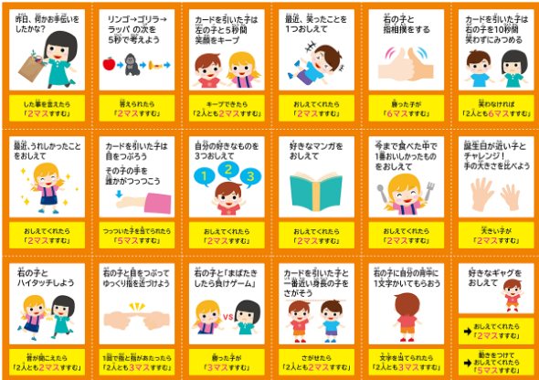 一般的なスゴロクではなく、イベントカードでじゃんけんに勝てた数だけ進めたり、コマの場所が入れ替わったりとハラハラドキドキするスゴロクです。ゲームの中でお互いの好きなことや考えていることを知り、こどもたちのコミュニケーションにつながる遊びとなっています。