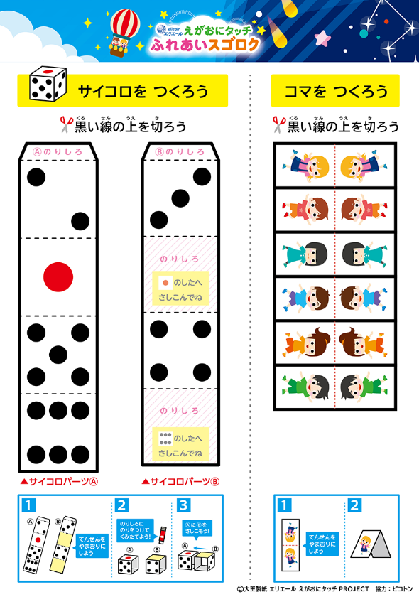 PDFファイルをダウンロードの上、指定サイズで印刷してください。サイコロとコマはハサミで線に沿って切ったあと、点線にあわせて貼ってお使いください。