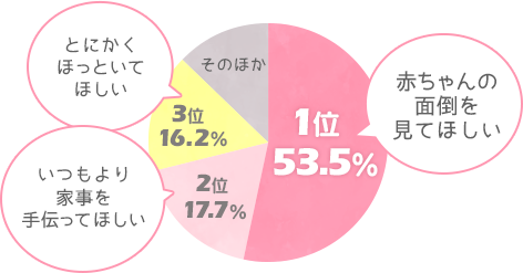 総数260人による調査の結果、1位は「赤ちゃんの面倒を見てほしい」が53.5%と圧倒的な数字。生理中で不安定な中でもコントロールの効かない赤ちゃんと一日中向き合っている女性の辛さが伝わってくる結果に。