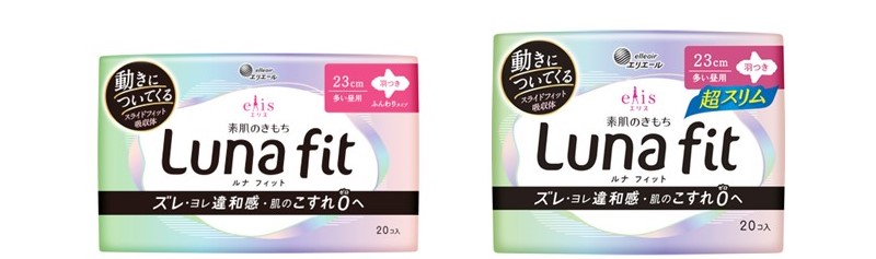 「エリス ルナフィット」シリーズは、独自開発の<スライドフィット吸収体>を採用。ナプキン内部に空間層を持たせることで、吸収体が自在にスライドし、体の動きに合わせてフィットします。また、羽つきタイプでナプキンと下着をしっかりと固定。肌とのすきまができにくく、ズレやヨレを防ぐことで、経血をしっかりキャッチしてモレも防止するナプキンです。