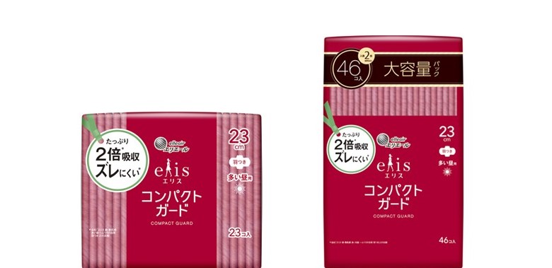 「エリス コンパクトガード(多い昼用)羽つき 23cm」は経血をたっぷり吸収するため、5時間※1つけていても快適をキープ。その上、1.9mmの極薄シートでスリムなのに、ショーツの接着部分の面積は122%※2にアップしていて、アクティブに動くときでもモレの心配がありません。おしゃれな素材感の個包装で、持ち運びがしやすいナプキンです。