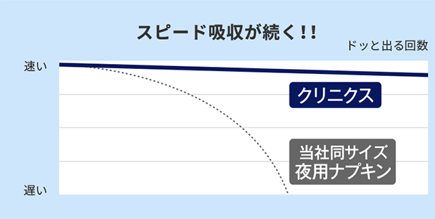 クリニクスは2層構造で素早く吸収できるように設計。ドバっと出た過多月経の粘度の高い経血を繰り返し吸収してくれるので安心です。