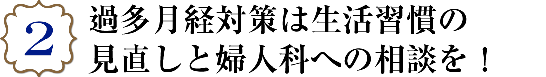 体が冷えると経血の量が増える場合があるので、体を冷やさないように心がけましょう。過多月経の人は鉄欠乏性による貧血を合併しているケースが多いので、鉄分の多い食事を摂ることも大事です。マッサージやエステなど血流をよくする行為は、かえって経血量が増えることもあります。症状がひどい場合は避けましょう。