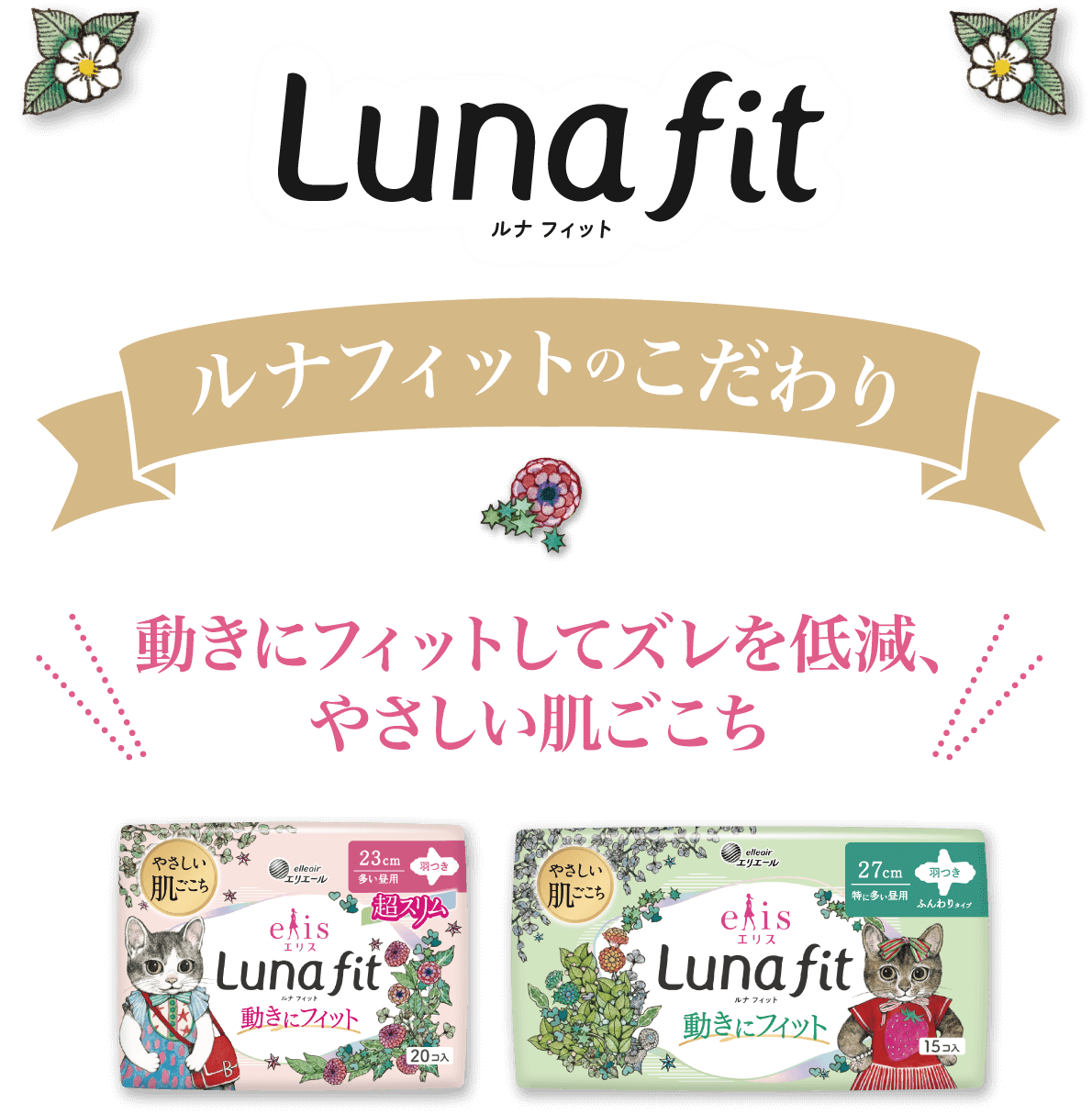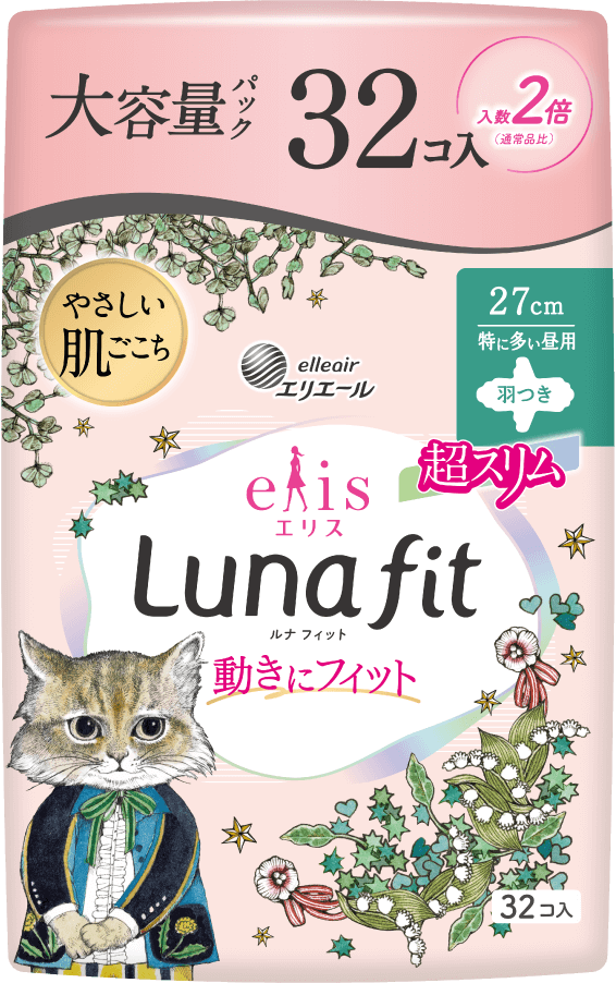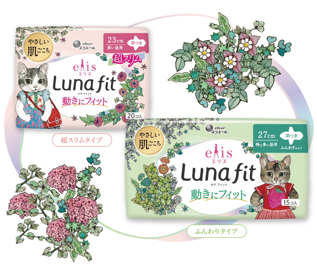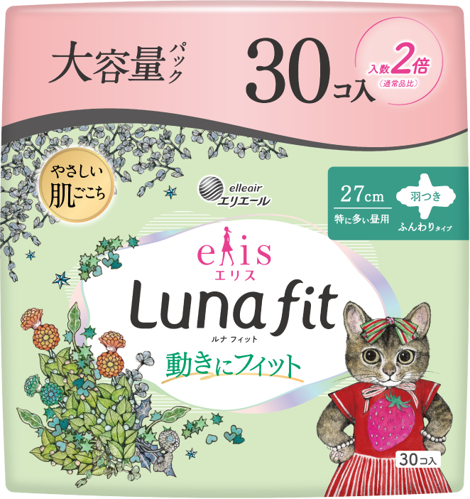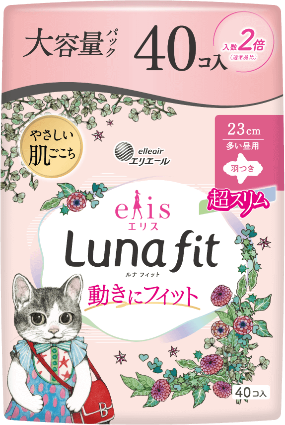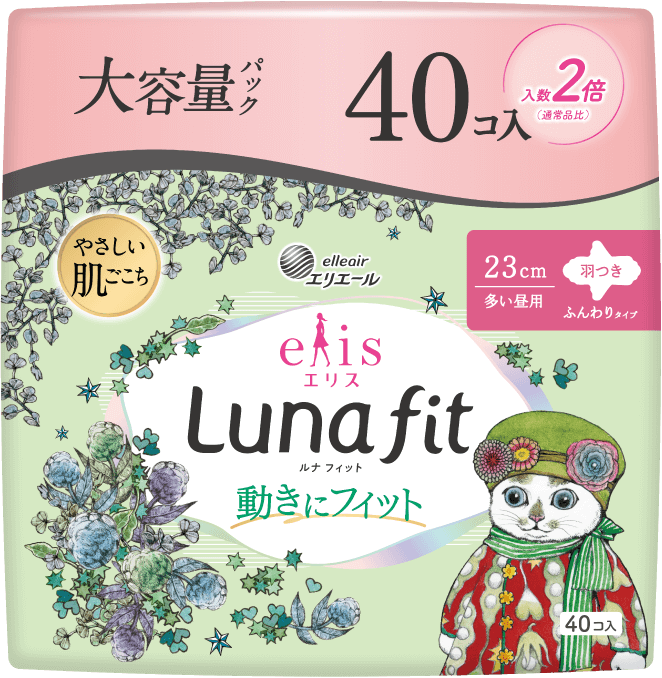 第3弾となる今回は、2025年4月に発売した生理用ナプキン「エリス ルナフィット」で初めてコラボレーションします。デザインは、コラボ第1弾で「エリス 素肌のきもち」に採用したネコがモチーフの6種類が再登場。コラボ第1弾販売時に多くの反響をいただいた人気のデザインで、全10商品(大容量パックを含む)を数量限定で全国発売します。