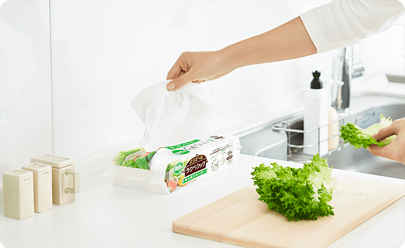 また、片手でサッと1枚ずつ取り出しやすいのもポイント。ちょっとこぼした水や調味料などを拭き取りたいときや、調理中で片手がふさがっているときなどに便利です。