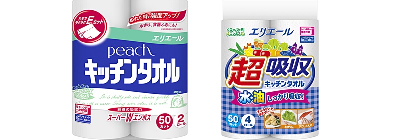 「エリエール ピーチ キッチンタオル」は、水や油をたっぷり吸収できるのが特長、「エリエール 超吸収キッチンタオル」は、吸収した水や油が表面に戻りにくいのが特長です。