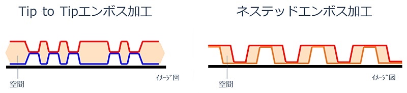 「エリエール ピーチ キッチンタオル」は、2枚のペーパーの凸と凸、凹と凹が重なり合うように貼り合わせた<Tip to Tipエンボス加工>を施しています。この加工により、ペーパーのあいだの空間が大きくなるため、水や油をたっぷり吸収できるのが特長です。