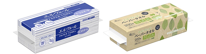 「エルヴェール ペーパータオル エコスマート シングル」はフィルム包装タイプ、「エルヴェール ペーパータオル 紙包装シングル」はパッケージも紙包装としています。