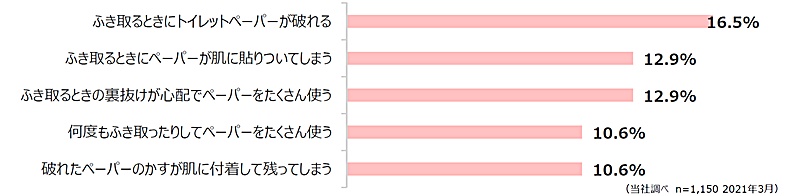 一方、大王製紙の調査では、「拭き取るときにペーパーが破れてしまう」「ペーパーが肌に貼りついてしまう」「拭き取るときの裏抜けが心配で、ペーパーをたくさん使ってしまう」といった、シャワートイレならではのお悩みがあることもわかりました。