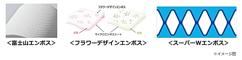 例えば、「エリエール トイレットティシュー」や「エリエール i:na(イーナ)」シリーズには、紙の厚みを抑えつつ、やわらかな品質を維持する「富士山エンボス」加工を施し、やさしい肌触りに仕上げています。また、「エリエール トイレットティシュー フラワープリント」や「エリエール 消臭+(プラス)」には、ふんわりとした厚みとやわらかさを兼ね備えた「フラワーデザインエンボス」を使用。
