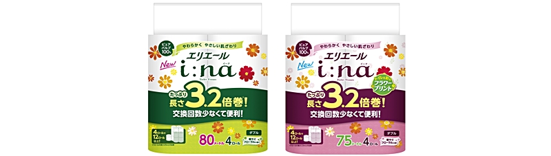 柔軟剤仕上げのやわらかな肌触りで、長さ2倍巻を実現したのが「エリエール i:na(イーナ)トイレットティシュー 2倍巻」です。長巻タイプでも1ロールの巻きの固さを均一にする独自技術を活用し、やわらかさとなめらかさを実現。ピュアパルプ100%で、華やかなフローラルの香りも特長です。また、ロール幅を110mm(通常品114mm)に小さくすることで、芯や包装フィルムを削減した、環境にもやさしい商品となっています。