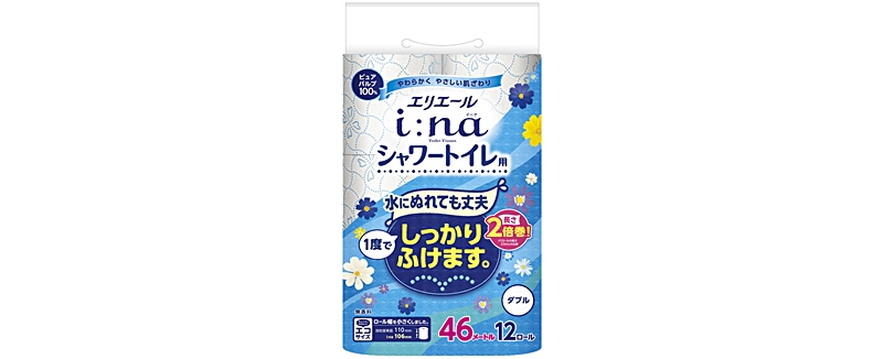 業界初のシャワートイレ用長巻トイレットティシューが、「エリエール i:na(イーナ)トイレットティシュー シャワー用2倍巻」です。シャワートイレ用のトイレットティシューは、丈夫で吸水性を良くするため、紙質を厚くする必要があり、紙質がうすくなる長巻タイプの実現は難しいとされてきました。