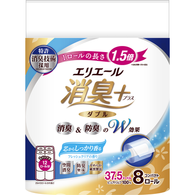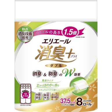 「エリエール 消臭+(プラス) トイレットティシュー」は、消臭&防臭のW効果で、トイレのお悩みを解決するトイレットティシューです。トイレットティシューの芯に、<爽やかな香り><揮発性消臭成分><防臭コート成分>を配合。壁や床に付着した尿ハネから発生するアンモニア臭を消臭し、トイレを爽やかな香りで包みます。しっかり香るフレッシュクリアの香りとほのかに香るナチュラルクリアの香りの2種類があります。