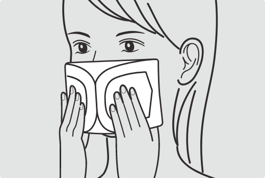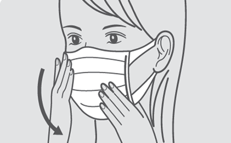 顔の大きさにマスクが合っているか確認し、ノーズフィッターを鼻の形に合わせて曲げて、プリーツを伸ばしてなるべく隙間が少なくなるように装着してください。