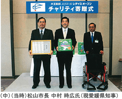 アテント商品10,000枚と、株式会社ニチイ学館よりご恵贈いただきました車椅子3台を合わせて、開催地の松山市と近隣市町が共同設置・運営する福祉施設に寄贈いたしました。