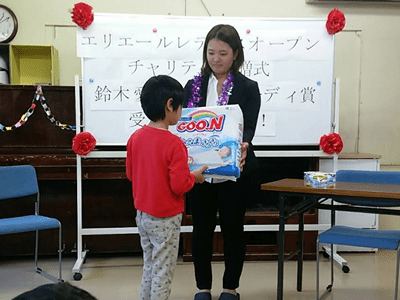 大会では“Always Keep Smiling!®”をスローガンとして掲げ、開催地である愛媛の子どもたちの笑顔と健やかな成長を願い、大会期間中のトータルバーディ数808個と同数のエリエール商品(グーン(ベビー用紙おむつ)、エリス(生理用品))を愛媛県下の児童福祉施設(18施設)に寄贈しました。