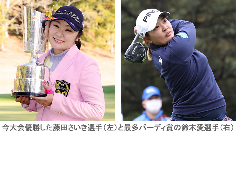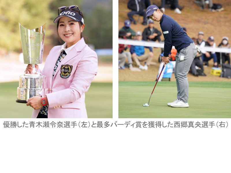 大会4日間のトータルバーディ数1,104個にちなんだ、1,104パックの「GOO.N(ベビー用紙おむつ)」を開催地である愛媛県下の児童福祉施設等へ寄贈いたしました。プレゼンターは最多バーディ賞を受賞した鈴木愛プロ。