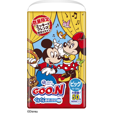 パッケージとおむつ柄には、「くまのプーさん」をM・Lサイズに、世界中から愛される「ミッキー&フレンズ」を BIG・BIG より大きいサイズに採用。 各サイズ6~8種、合計28種のおむつ柄デザインで、笑顔あふれる豊かな表情のキャラクターが描かれています。サイズごと に異なるデザインで、おむつ替えの時間を楽しく彩ります。