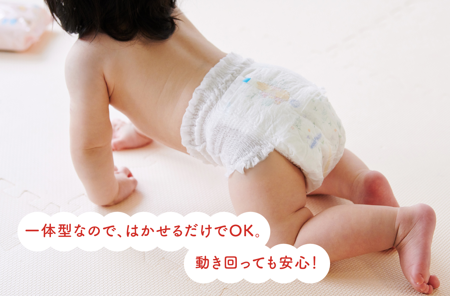 赤ちゃんは寝返りを習得すると、“動きたいスイッチ”が常にONになります。そうなると、テープタイプのおむつをはかせるのはなかなか大変ですよね。パンツタイプは赤ちゃんがじっとしていなくても、はかせるだけでOKなのが、テープタイプと比べた際の一番のメリットです。ギャザーで身体にフィットするので、元気に動き回る赤ちゃんにはぴったり。また幼児期になってくると、はく際に足を上げたりといったことも覚えて、自分ではく練習にもなります。