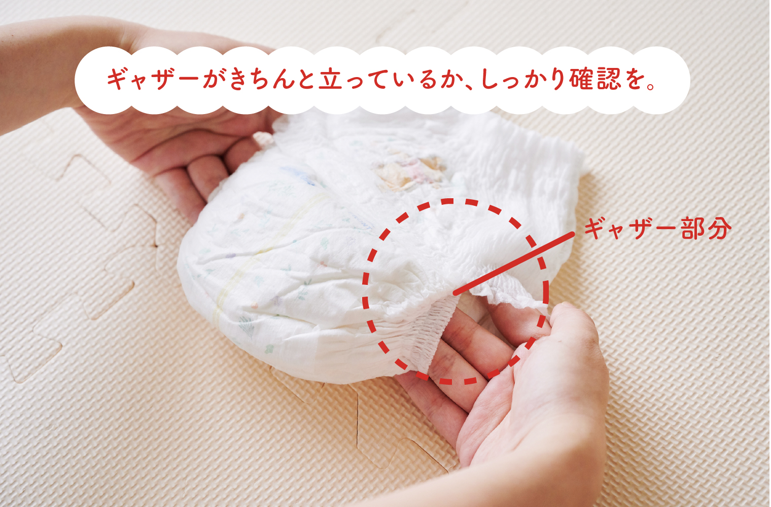 はかせる際には、おへそまでしっかり隠れていること、足まわりのギャザーがきちんと立っていることを確認しましょう。