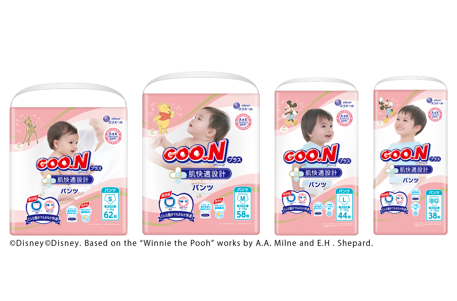 他にも、「グーンプラス 肌快適設計パンツ」には、ムレやモレを防ぐ工夫が満載。各サイズで異なるキャラクターを採用したディズニーデザインも魅力のひとつで、成長を実感しながら楽しくおむつ替えができます。