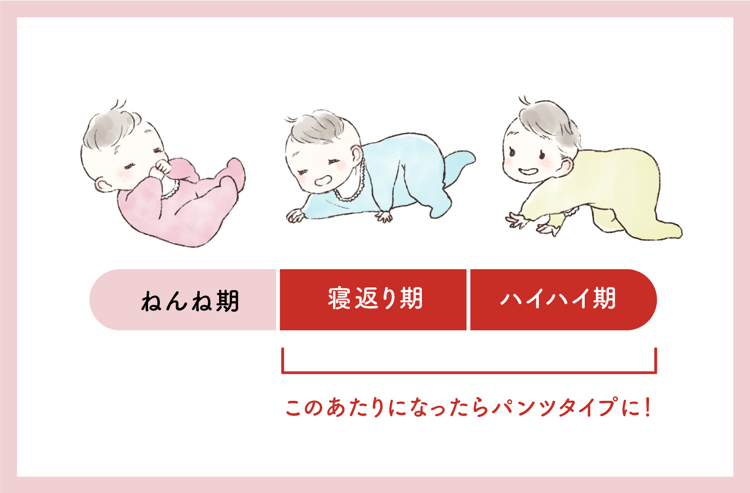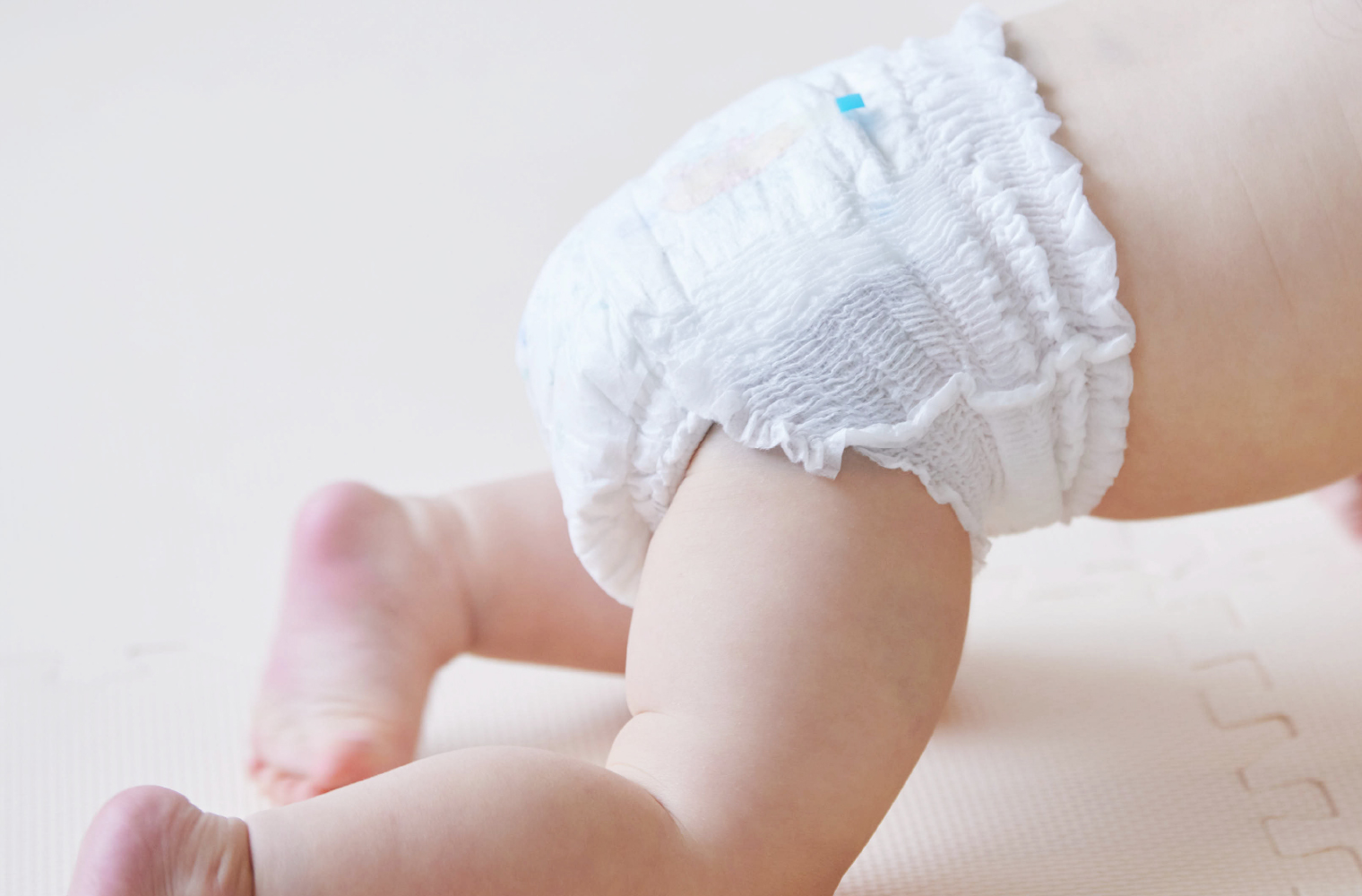 個人差もあるので、いつからという明確な決まりは特にありませんが、寝返りやハイハイをするようになってからパンツタイプに移行するママがほとんどです。赤ちゃんがコロコロと寝返りしだしてテープタイプのおむつがしっかり装着できなくなってきたら、漏れの原因にもなるのでパンツタイプに変える目安にするといいですね。