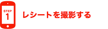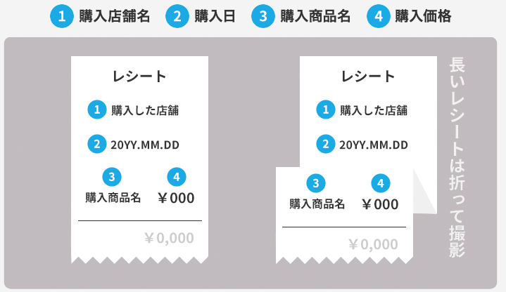 レシートを、①購入店舗名 ②購入年月日 ③購入商品名 ④購入金額 が映るように撮影してください。