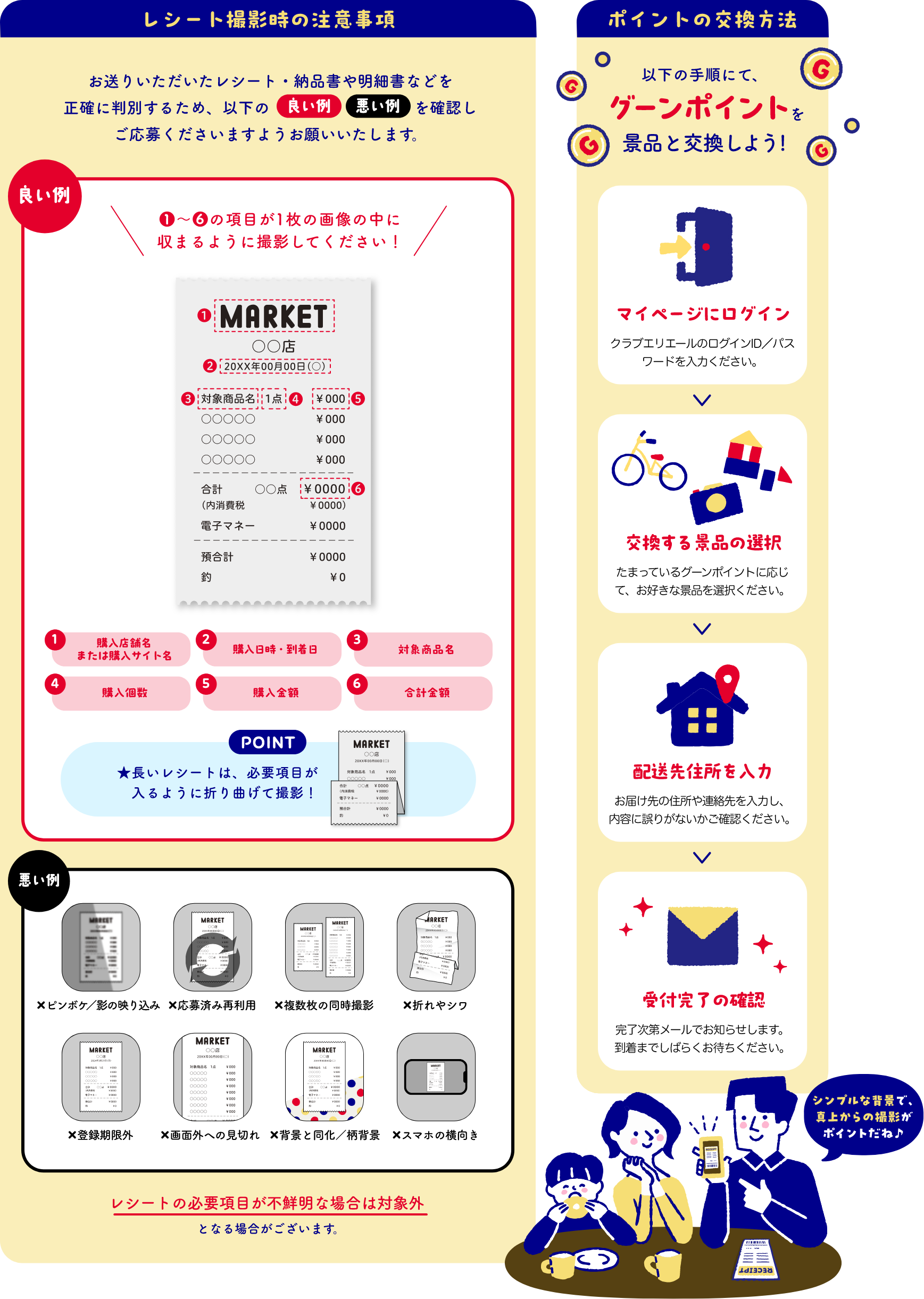 ※レシート内容に不備があった場合は、「レシート非承認メール」(再提出のお願い)をお送りしますので、レシート内容をご確認の上、ポイント申請期間内に再度レシート画像をアップロードください。