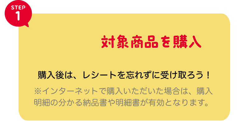 ※インターネットで購入いただいた場合は、購入明細の分かる納品書や明細書(インターネット購入の場合は納品が完了しているもの)が有効となります。
