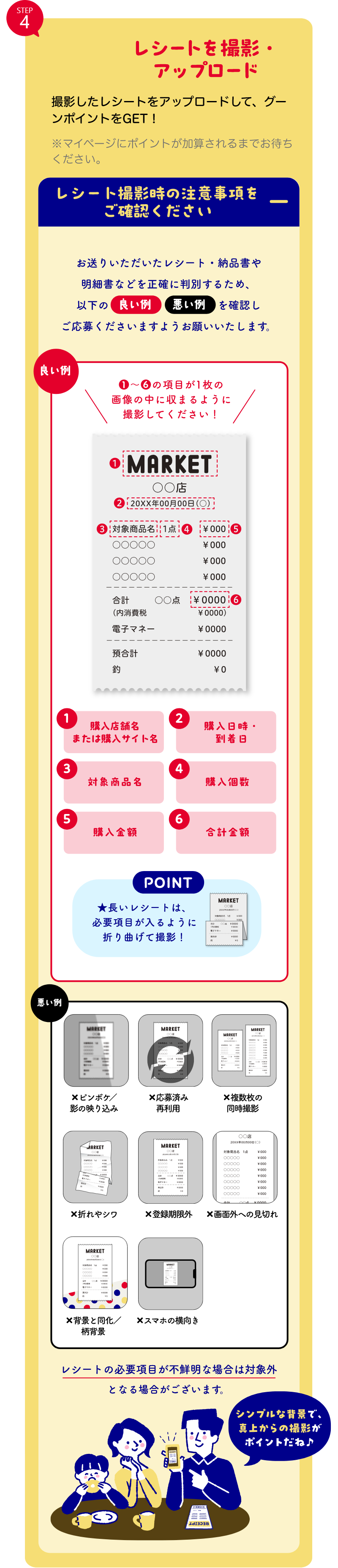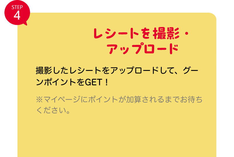 ※レシート内容に不備があった場合は、「レシート非承認メール」(再提出のお願い)をお送りしますので、レシート内容をご確認の上、再度レシート画像をアップロードください。