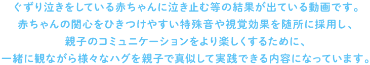 - 子育てにはハグのような肌のふれあいが大事だと思った。柔らかい絵と音楽で子供が好きそうだと思った。