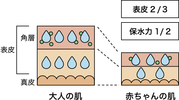 しかし、赤ちゃんの肌は成長過程にあるので、表皮は大人よりも薄く、角層の細胞は小さく未発達なため、大人の約2/3程度の薄さしかありません。また、赤ちゃんの肌は細胞間脂質が少なく、肌の保湿機能をつかさどる角層細胞の天然保湿因子の量も大人の半分程度しかありません。
