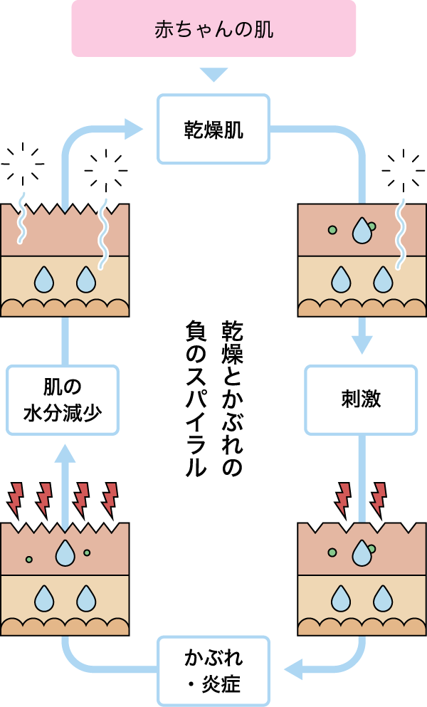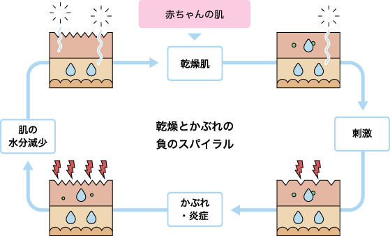 言葉が十分に理解できない赤ちゃんは、まだやってはいけないことなどが理解できません。かぶれや炎症が起きてかゆみを感じ、皮膚をさらにかき壊すことによって、皮膚に傷ができ、傷口から水分が減少し、さらに乾燥肌が進む悪循環、「乾燥とかぶれの負のスパイラル」が起きていくのです。
