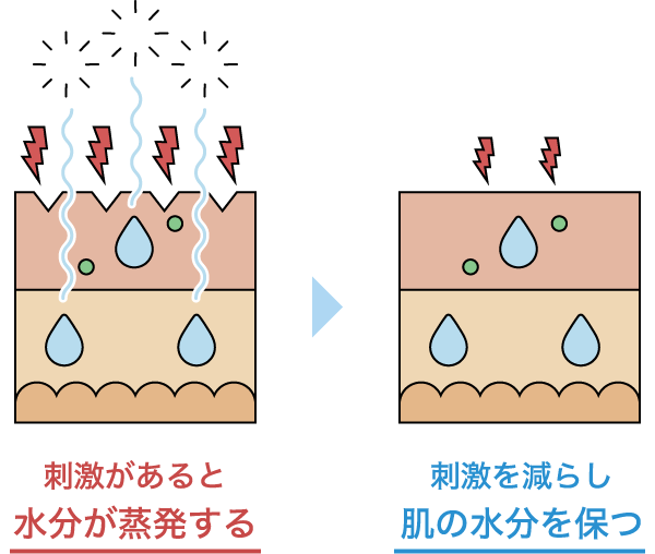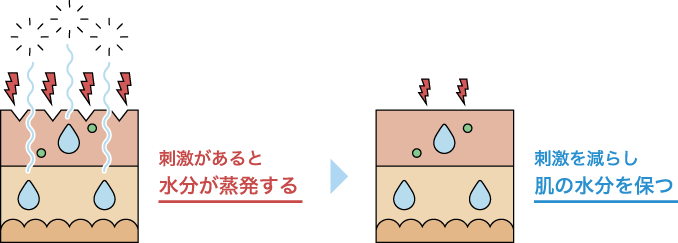 赤ちゃんを「乾燥とかぶれの負のスパイラル」から守るためには、刺激をなるべく受けないようにすることが重要です。刺激が少なくなることで、かぶれや炎症が起きにくくなり、表皮からの水分蒸発が防がれ、肌の水分量を保つことができるのです。