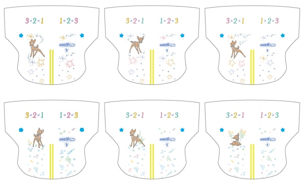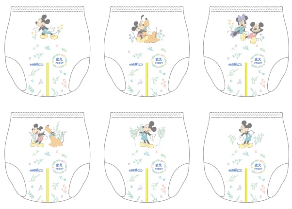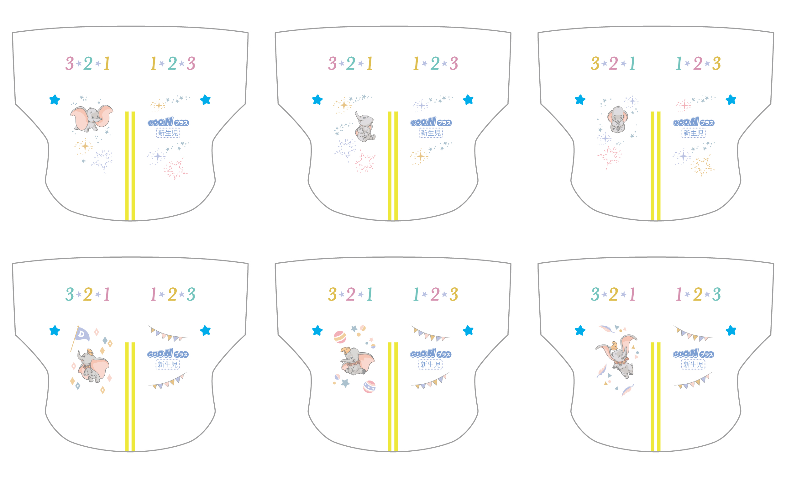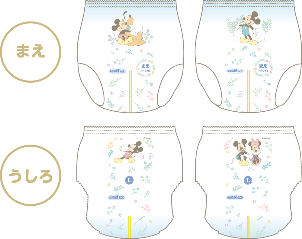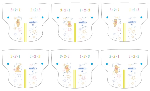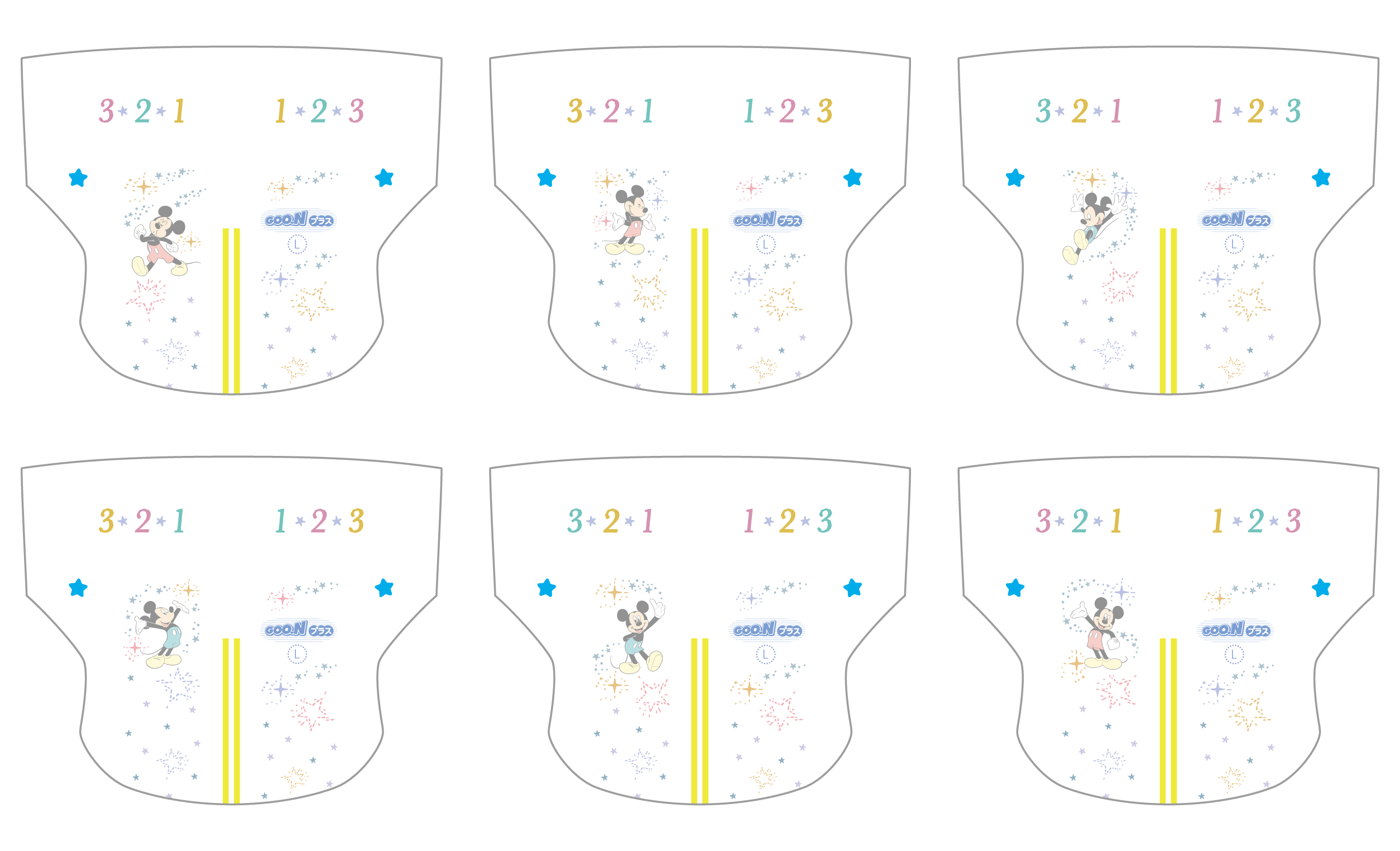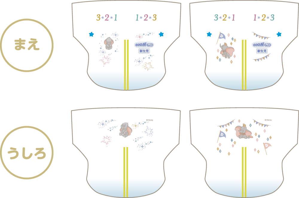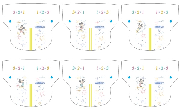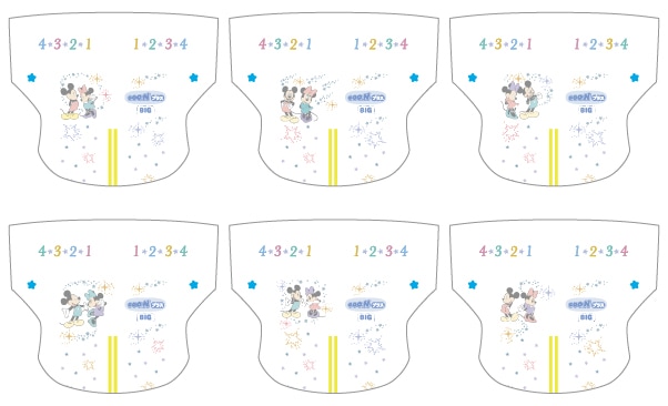 おむつのサイズが変わるごとにキャラクターも変わるので、成長を実感しながら楽しくおむつ替えができます! ※おむつイラストはイメージです。
